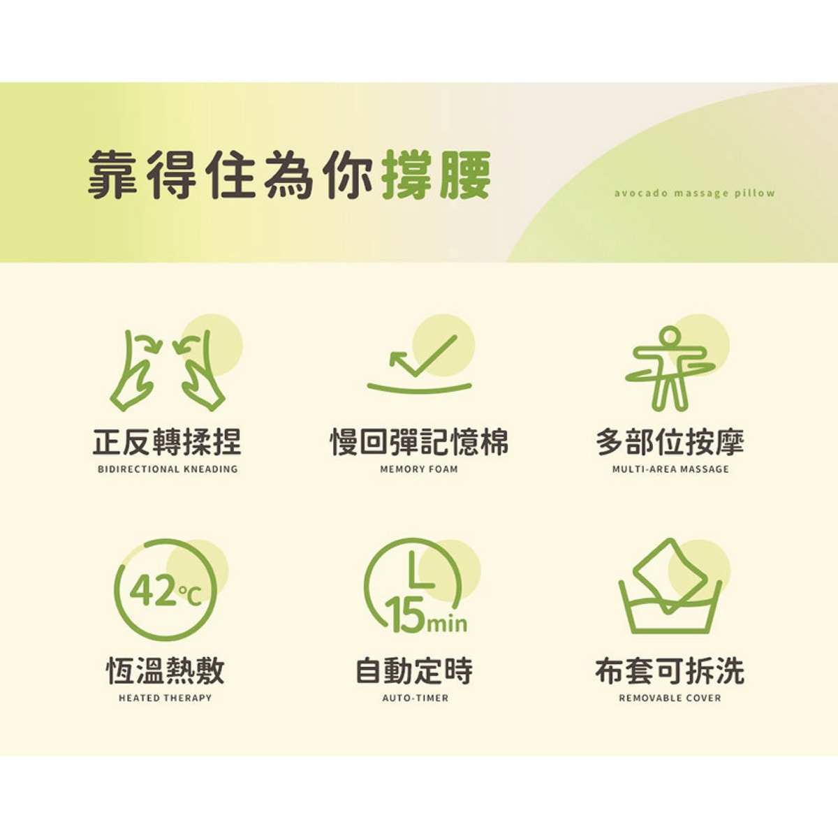 3ZeBra - 酪梨枕 溫感按摩腰靠枕 集按摩、靠墊、熱敷於一身,平滑按摩頭設計,能緊密貼合腰部曲線,擬人手雙向旋轉按摩頭,每分鐘自動切換,42°C 恆溫熱敷功能,能促進血液循環,放鬆肌肉,無論是腰部、背部或腿部,都能享受舒適的按摩。適合長時間久坐的上班族、經常開車的司機、腰部不適的中老年人,或者是需要緩解身體疲勞的人!