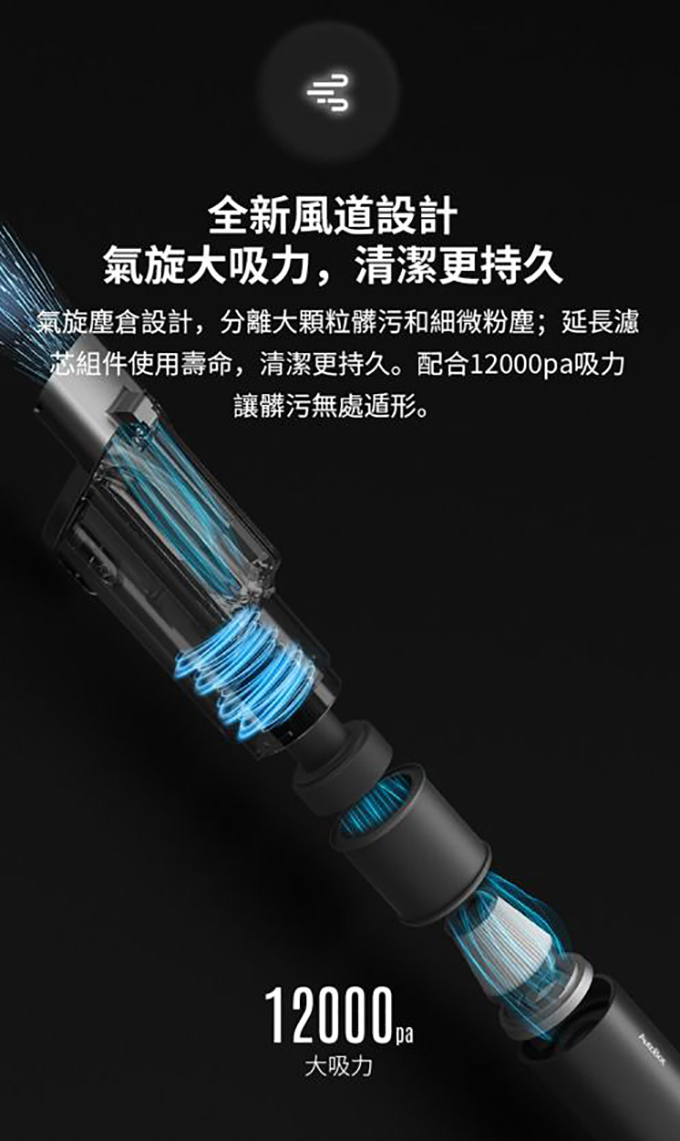 Vmini MAX2最大賣點就係擁有強勁既吸力但體積細小,兩檔吸力模式,滿足不同使用環境,普通吸力有6500pa,而最大吸力更提升到12000pa,相當誇張。氣旋設計令塵埃防堵塞,使用會更持久,隨機附送二合一既吸管塵掃,無論係車用或家用都更加方便。全新集塵盒容量達150ml,輕易打開倒出垃圾既開關,既方便又衛生。