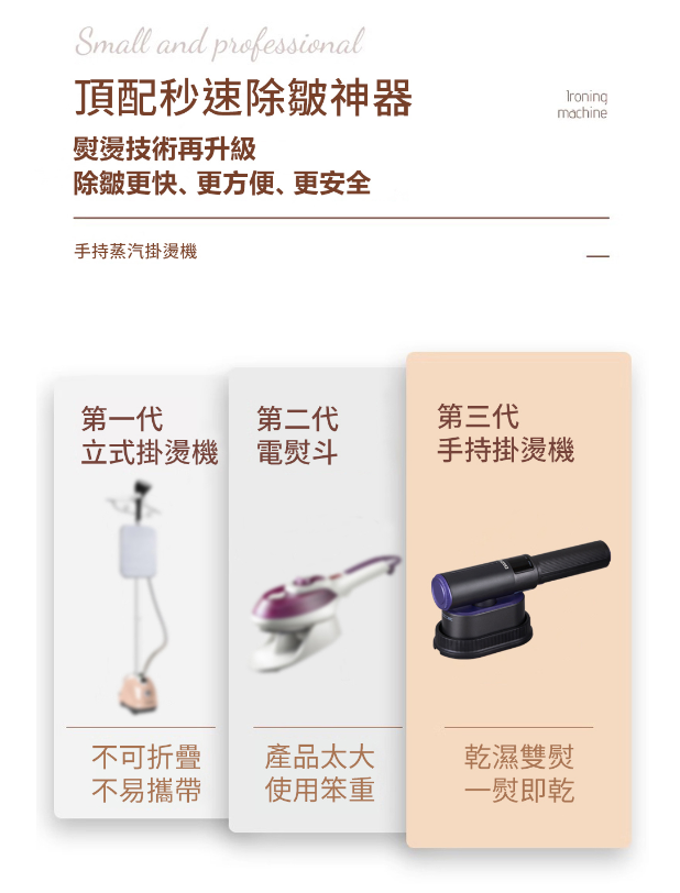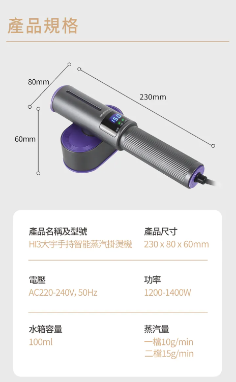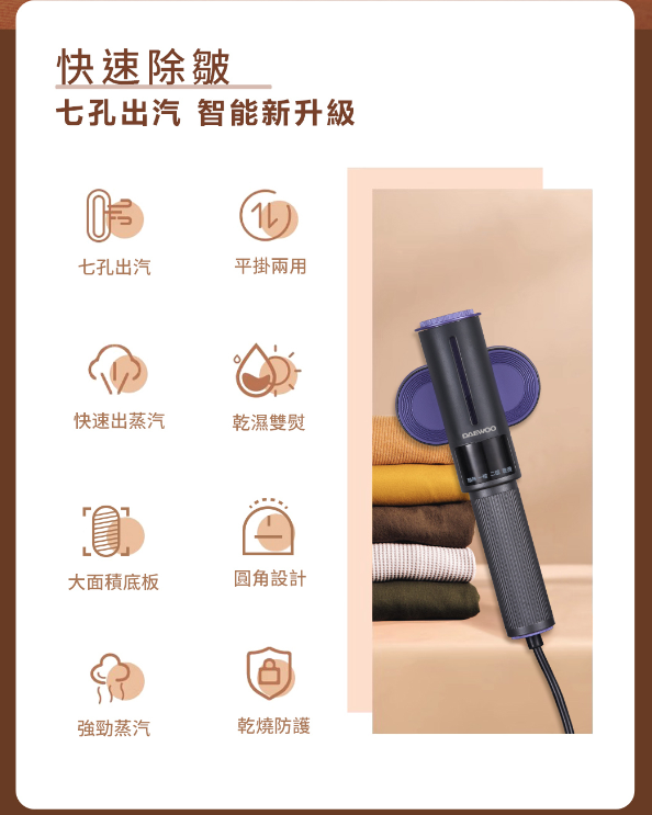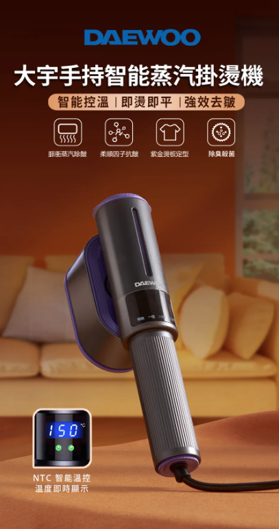 DAEWOO新款HI3手持智能蒸汽掛燙機, 輕感即熱,三重增壓強脈衝蒸汽,高速除皺,獨特紫金燙板設計,極速導熱,受熱平均。NTC 智能溫感可視化面板,即時溫度顯示,可調節溫度,避免燙傷衣物。另90度可旋轉設計,可平燙 / 吊掛燙兩用,出門前5分鐘就可以解決燙衣困擾,超方便!