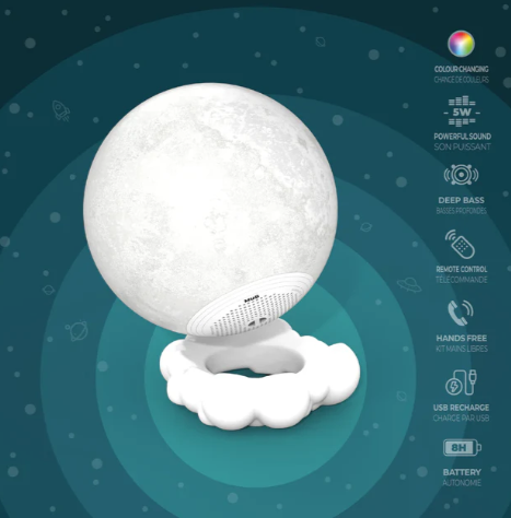 法國 品牌MOB 推出月亮造型燈的喇叭,會著燈的喇叭,好看還很實用,可以隨時轉換燈的顏色,有氛圍感外,還可以放音樂,同時配合搖控器操作,使用上更方便,USB充電後可用8小時!