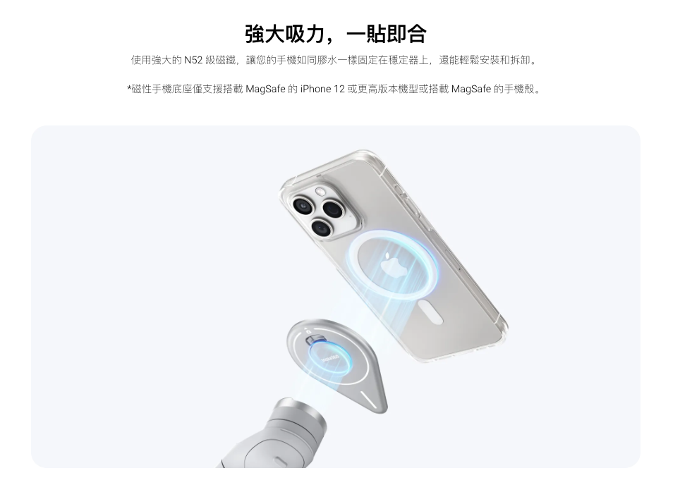 磁性手機底座僅支援配備 MagSafe 的 iPhone 12 或更高版本或配備 MagSafe 的手機殼。