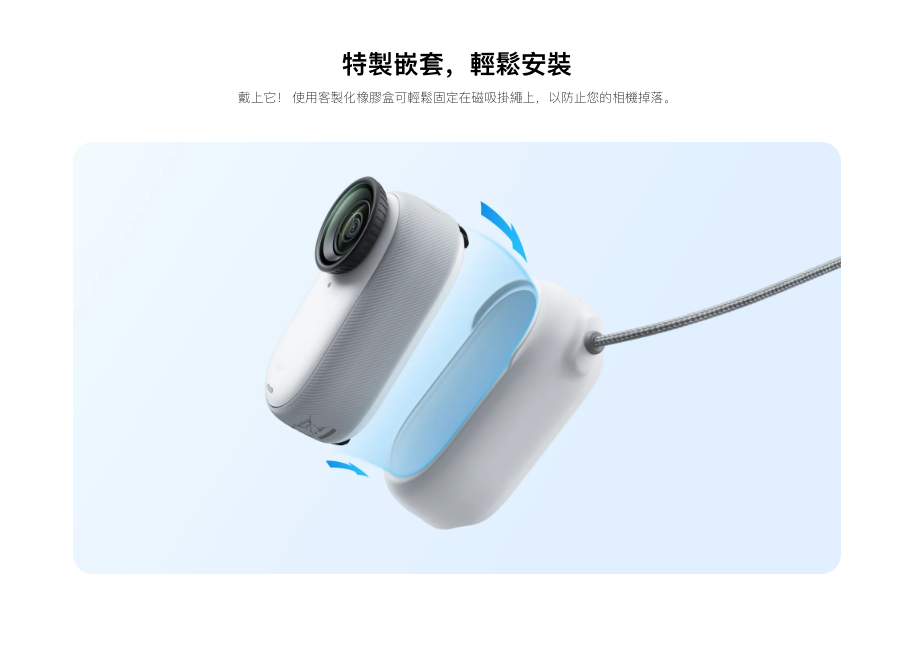 可輕鬆連接到磁吸吊墜的繩索上,並配有訂製設計的保護殼以確保相機安全。