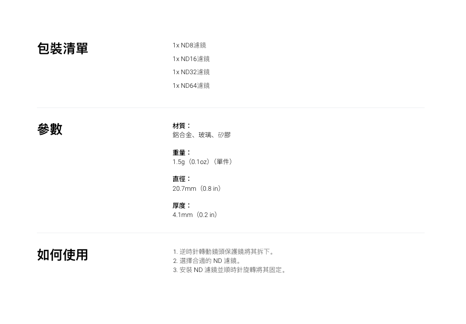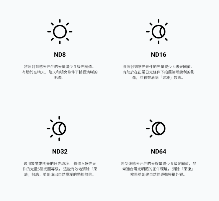 包括ND8、ND16、ND32和ND64濾鏡,可做到四級減光。
