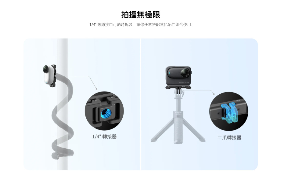 透過 1/4" 螺絲和 2 爪安裝連接輕鬆更換配件。