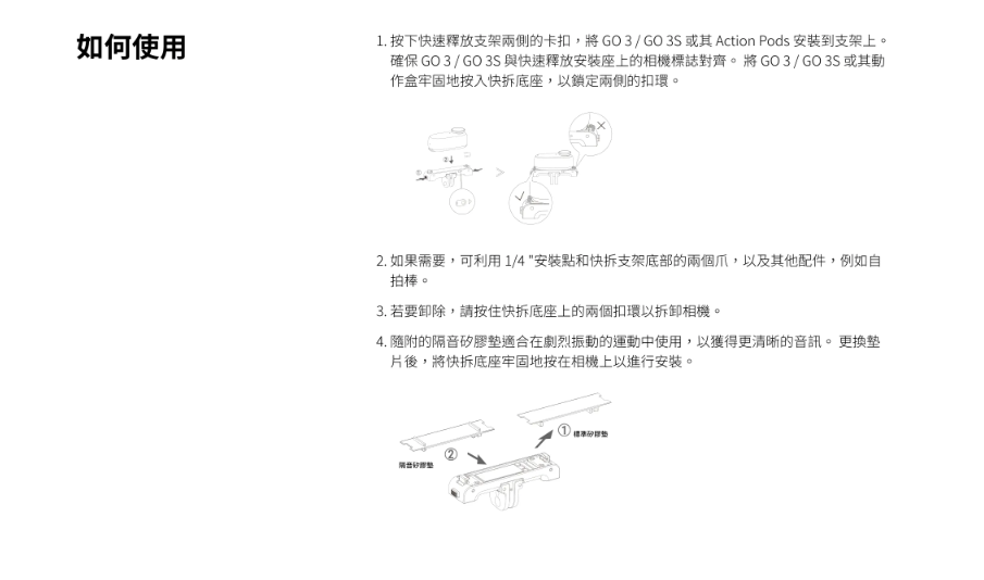 安裝獨立的 GO 3/GO 3S 相機或 Action Pod。