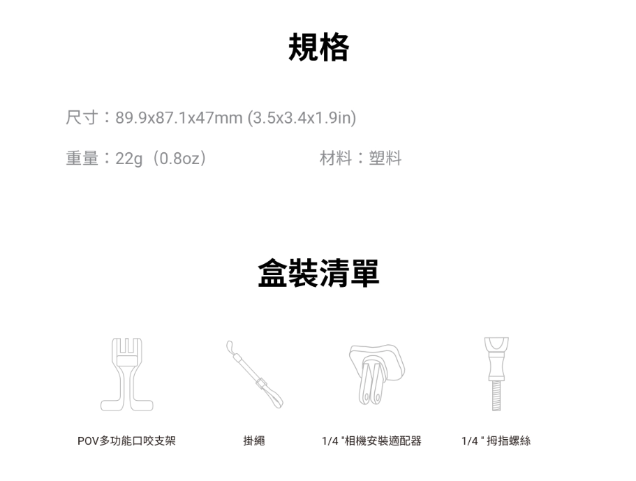 一個多用途的配件,可以作為口部支架、三腳架、手把、掛鉤支架等使用。