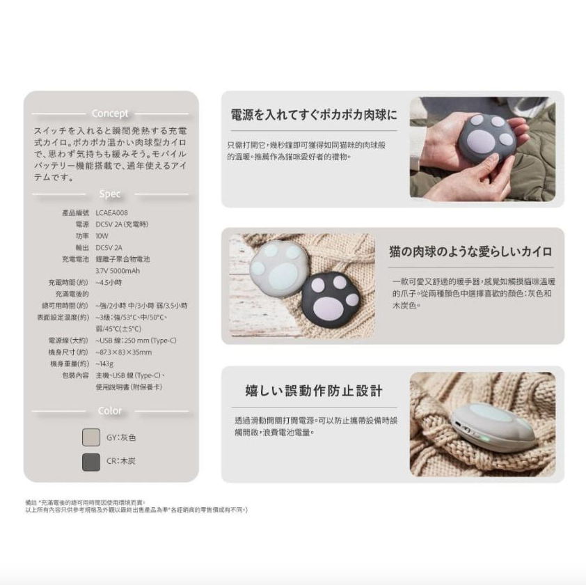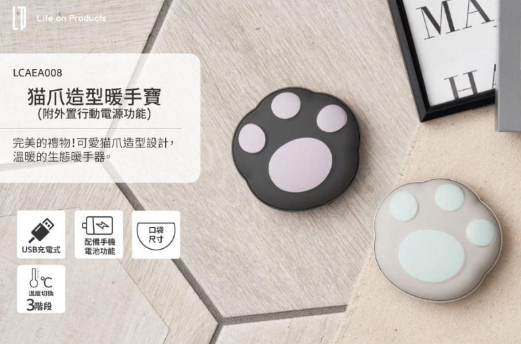 日系可愛的猫爪造型設計,開機只需數秒便能速熱,內置電池容量高達5000mAh除了能作暖手寶用還具備行動電源功能,重量僅有約143g,3段溫度調節最高達53℃,讓您能任意調整最適溫度,兼具可愛又實用的暖手器,是冬日中必備首選。