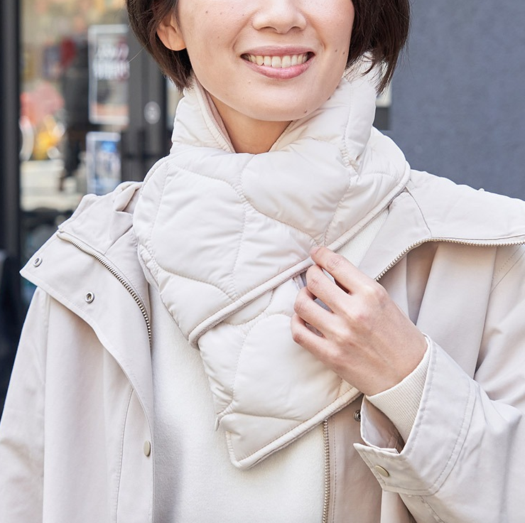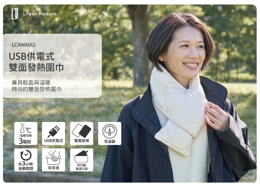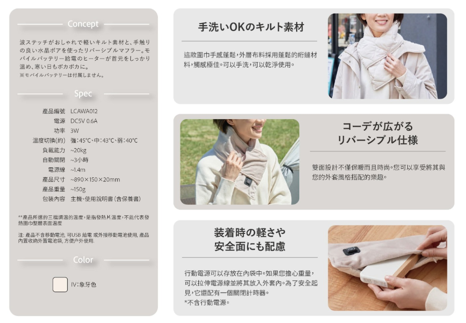 日系簡約設計的雙面圍巾, 3段溫度恆溫系統調節最高達約45℃,內建的加熱器可以溫暖您整個頸部,重量只有約150g,在冬日配戴時可感受到溫暖. 秋冬外出首選.