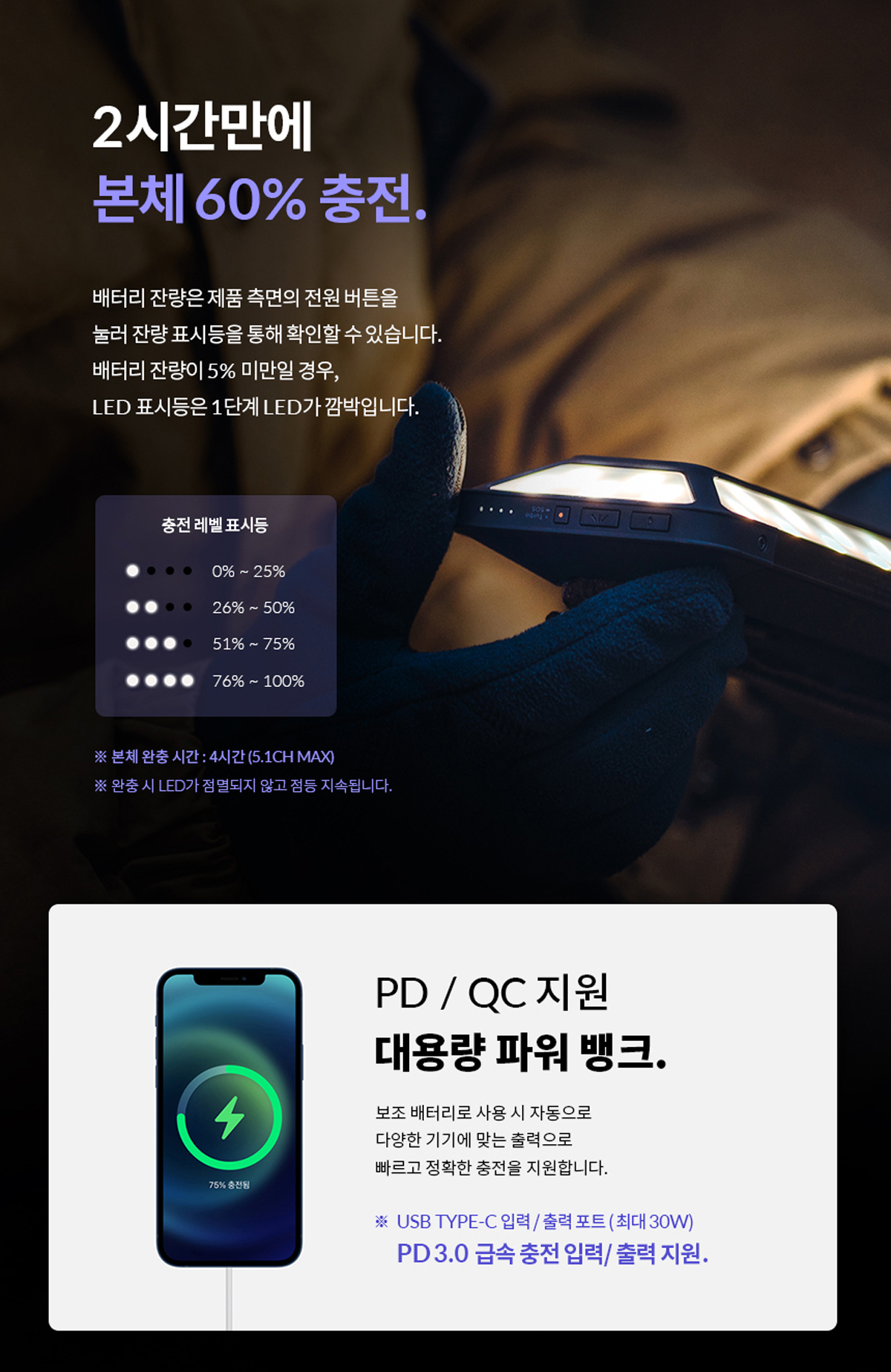 擁有高亮度與大容量電池的獨特設計,無論露營、釣魚還是工作都能同時作為照明工具與行動電源使用。