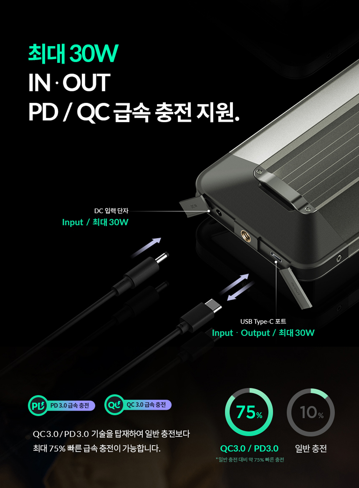 搭載Type-C PD快速輸入/輸出充電埠,最高支持30W的PD 3.0/QC 3.0快充,較普通快充快75%。