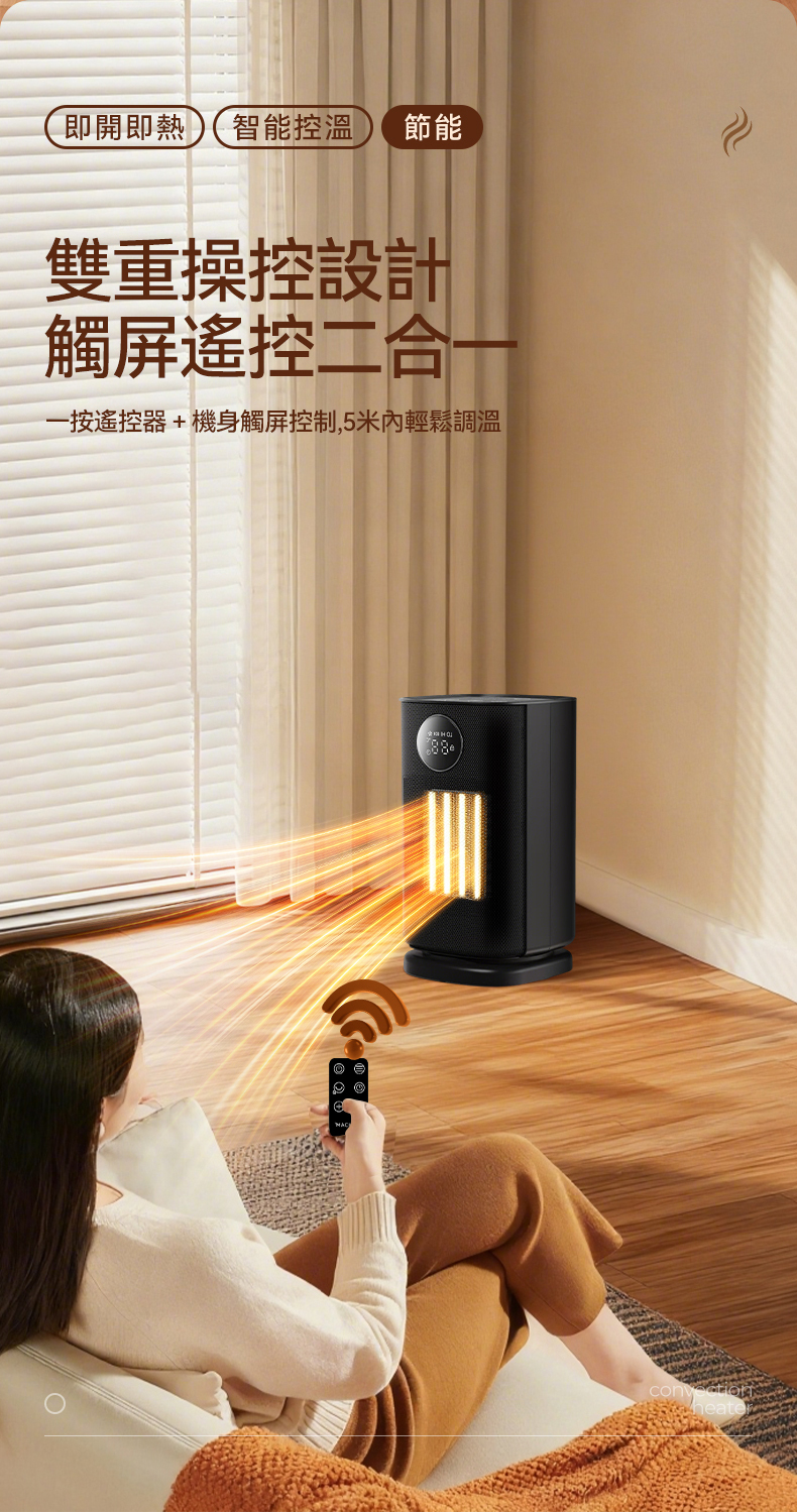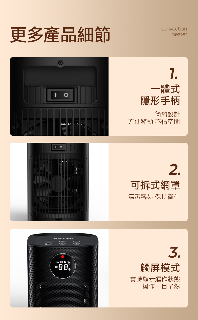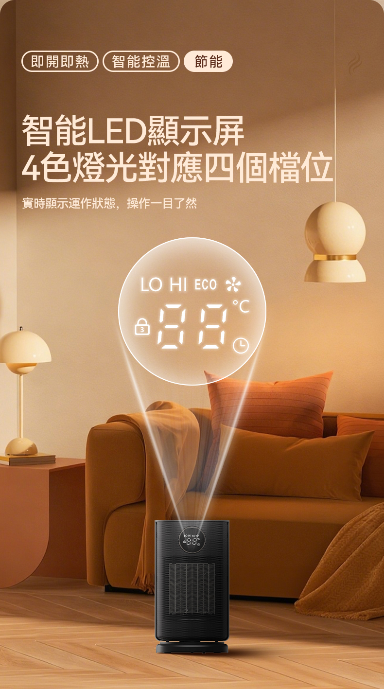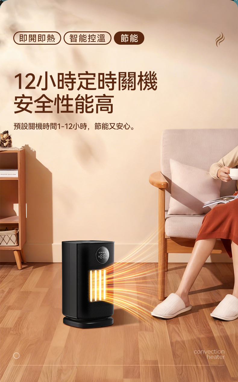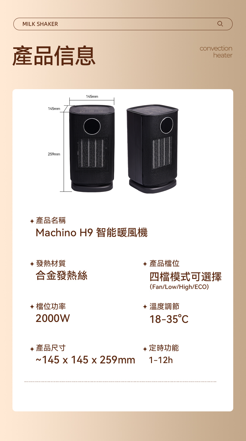 MACHINO 新出H9智能暖風機!搭配PTC陶瓷速熱,極速加暖。配備四檔智能模式(送風/低暖/高暖/ECO節能),18-35℃精準溫控隨心調節。70°自動搖頭擴大送暖範圍,打造1.5米環形暖風圈!1-12小時預設關機+三重安全保護(防斷電、傾倒斷電、過熱保護)搭配遙控與觸屏雙操控,安全便捷,暖意覆蓋每個角落,讓您在冬天也能打造溫暖舒適環境。