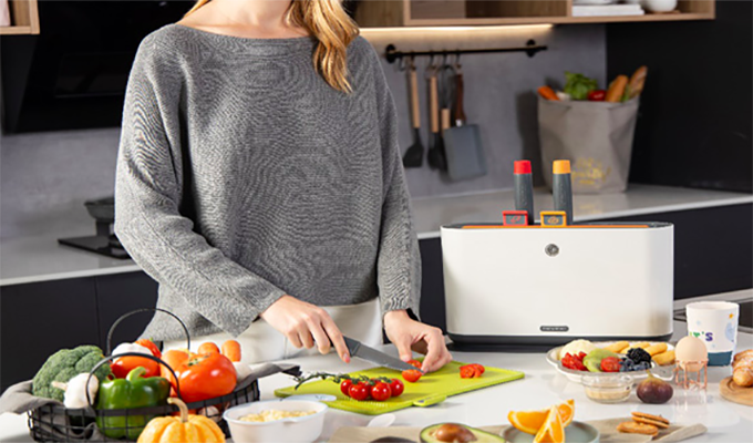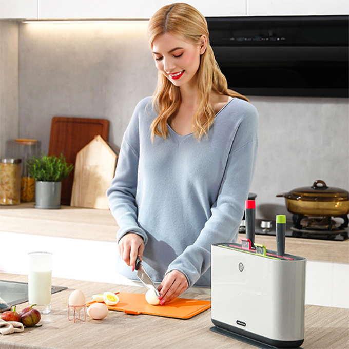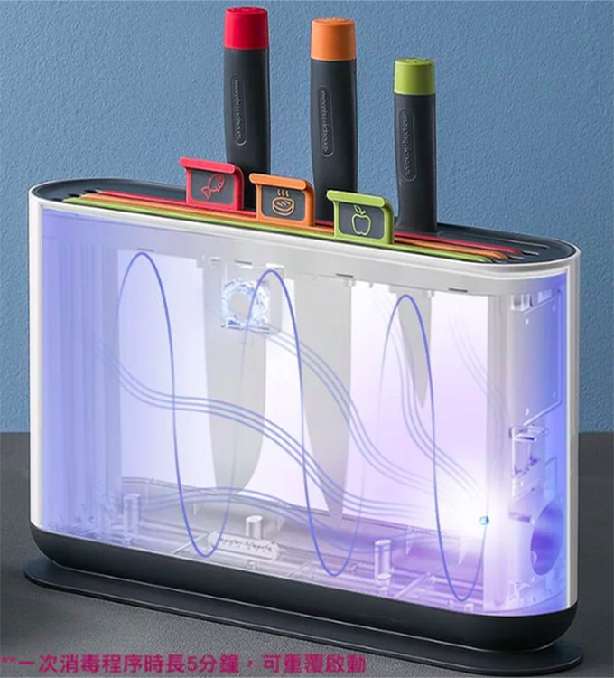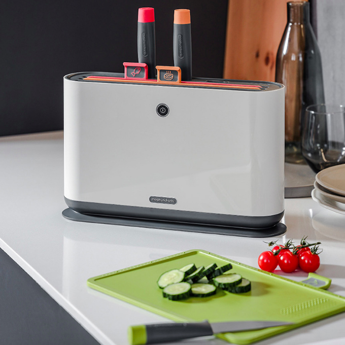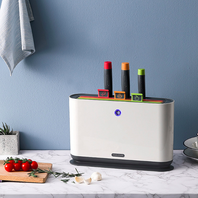 MORPHY RICHARDS MR1000刀具砧板消毒機是由MORPHY推出的新概念健康廚具,它集食物分類處理、智能消毒、一體收納於一體,可以有效解決刀具和砧板的分類、抑菌、收納等用戶關心的廚房問題,進一步培養健康廚房的好習慣。