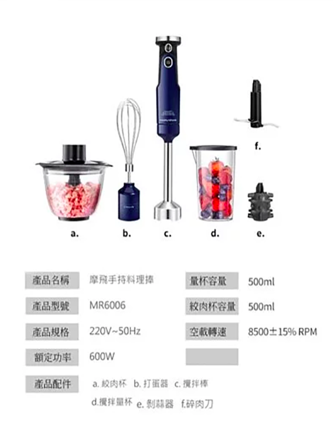 全套配有:剝蒜器、打蛋器、500mL紋肉碗、攪拌捧、攪拌肉刀、500mL攪拌量杯