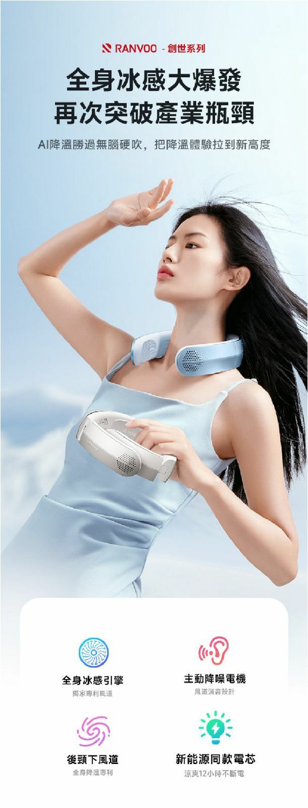 RANVOO FG2D採用了新升級冰感引擎,不像一般風扇只是加強自然風,而是將自然風產生成冰爽涼風再吹出,進一步降溫,猶如掛上了一台迷你空調,夏天不再炎熱!