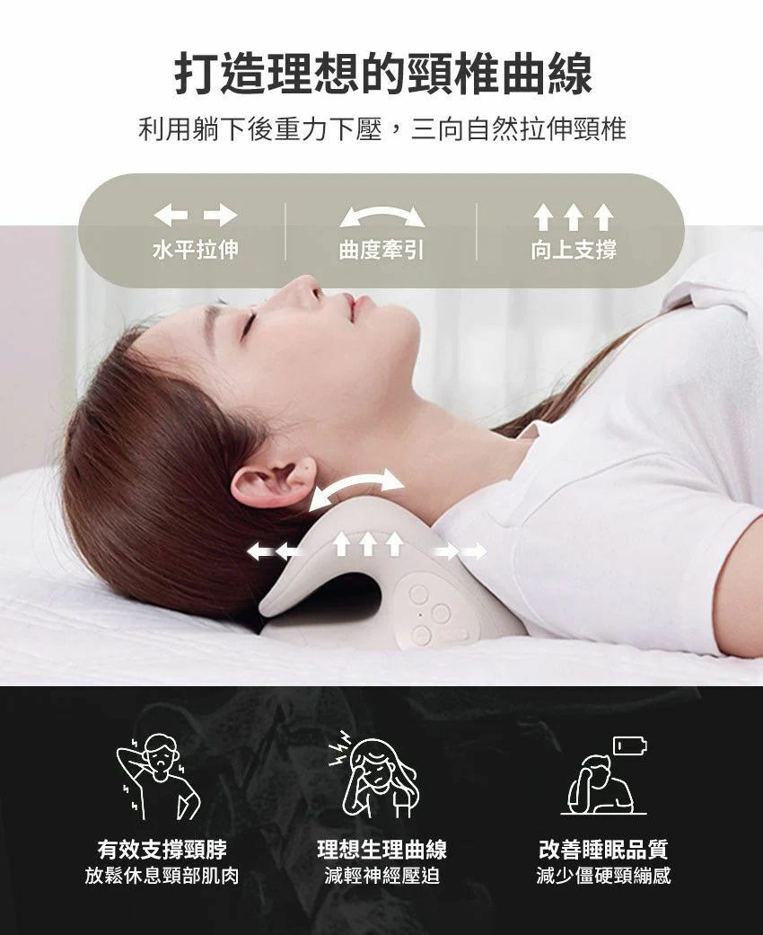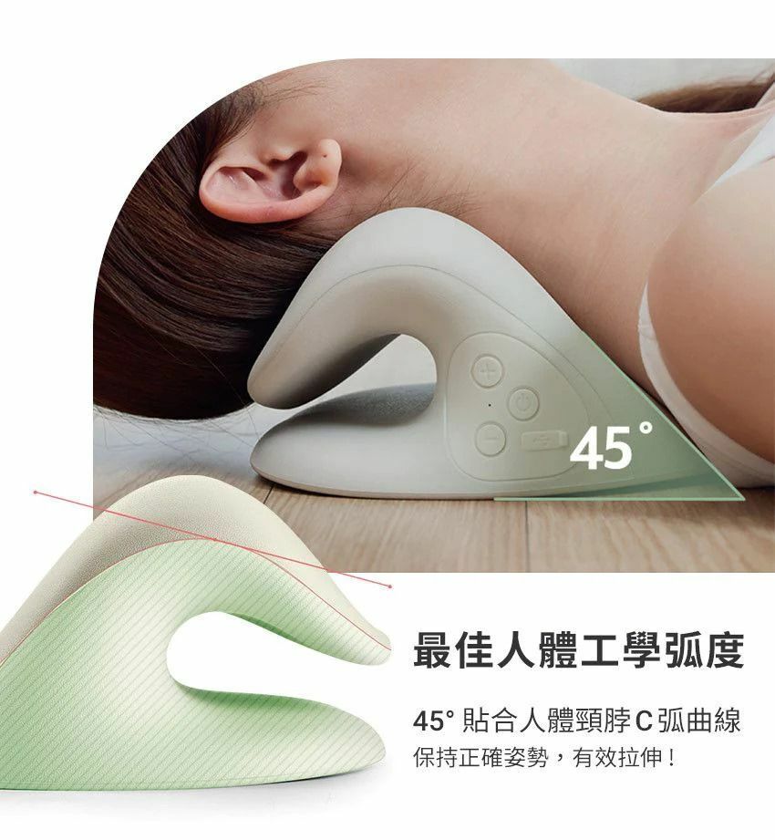 導致肩頸有問題出現,這款頸椎熱敷牽引枕,除了可拉伸肩頸外還有熱敷的功能,二合一護理頸部,符合人體工學,C 弧曲線設計。