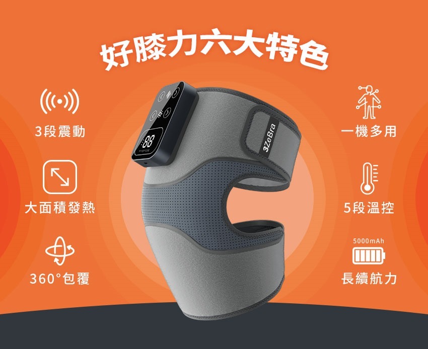 台灣品牌 3zebra推出溫感膝部按摩器,可以大面積熱敷功能,一機多用,無論膝蓋、肩膀定手肘位置一樣可能使用,有內袋位置可以放藥包熱敷,360度包圍,而且還有三個震動模式,5段溫控選擇!